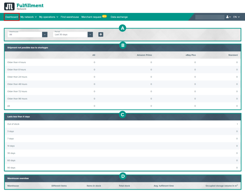 On this page, you will find a detailed description of the Dashboard. You can access the dashboard in JTL-FFN via the Dashboard button.