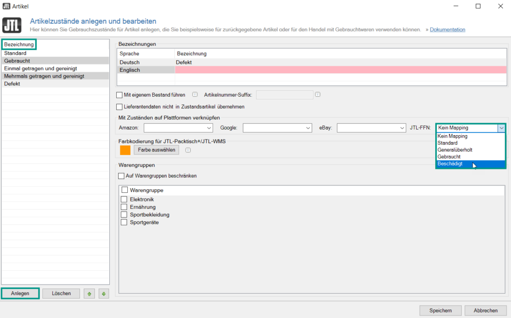 - In the Bezeichnung (Name) area, select an item condition, for example Defective. Alternative: If you want to configure an item condition that is not yet listed by default, click the Anlegen (Create) button to create a new item condition.