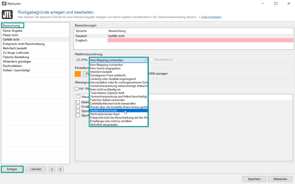 - In the Plattformzuordnung (Platform assignment) area, select the return reason for JTL-FFN from the drop-down list that most closely matches your return reason created in JTL-Wawi.