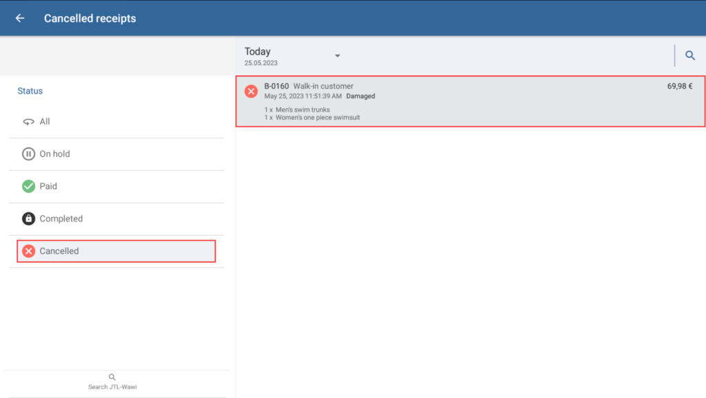 You can find receipts cancelled in this way in the overview All receipts > Cancelled until day-end closing.