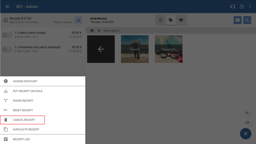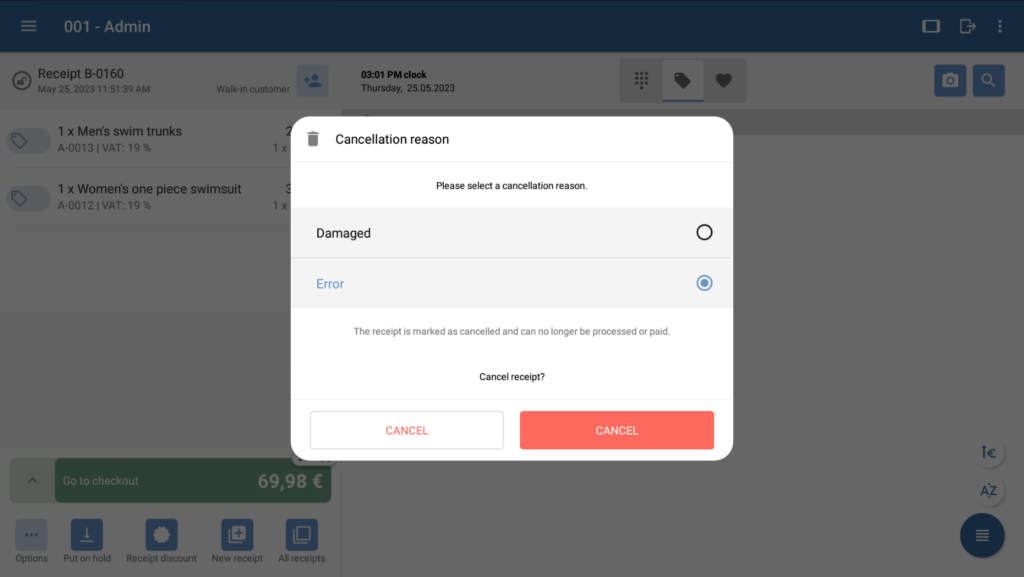 Instead of individual items, you can also cancel an entire receipt. This makes sense, for example, if your customer backs out of the purchase before payment is made.