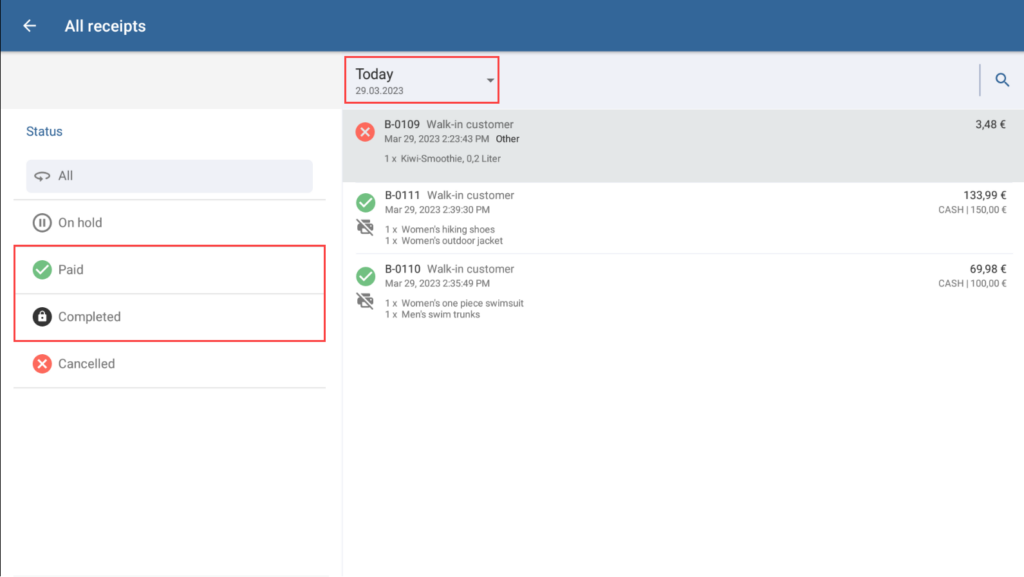 - Select Paid to view the receipts for which a day-end closing has not yet been carried out. Select Completed to view older receipts. If needed, set a time range, e.g. This week.