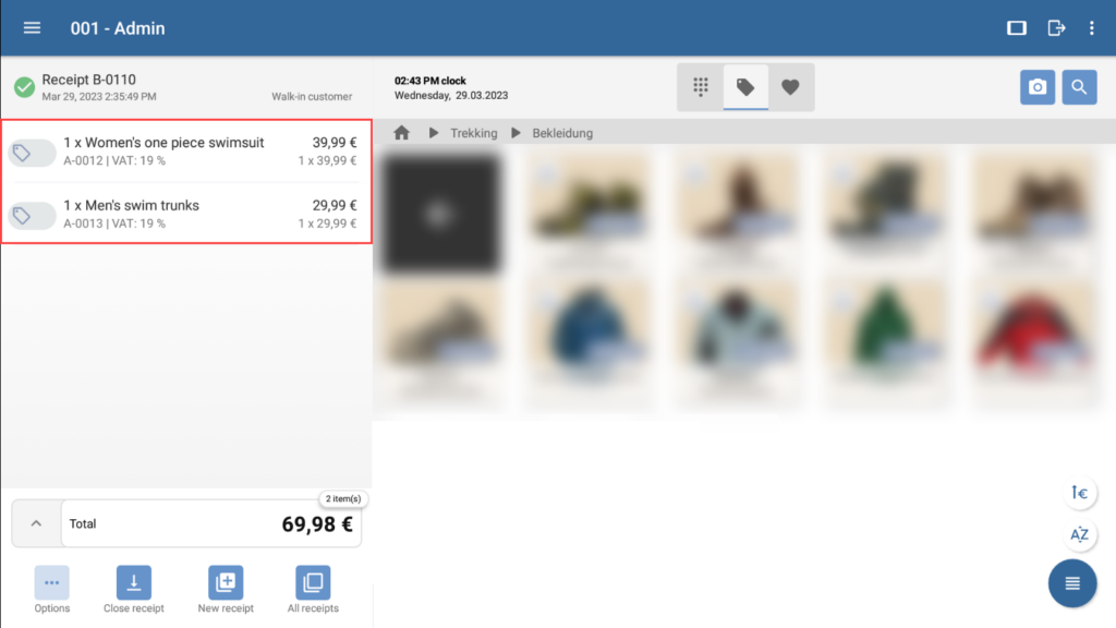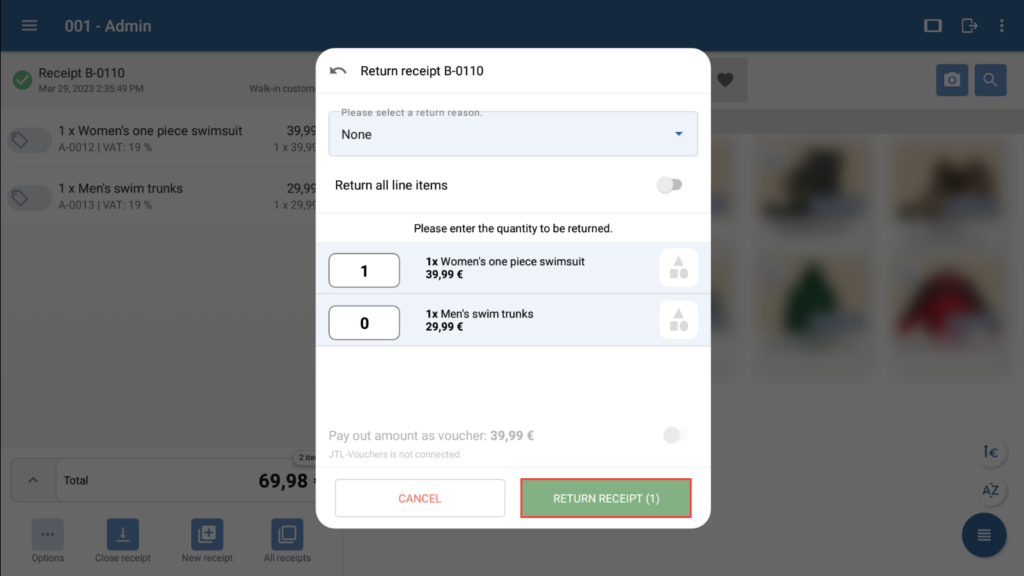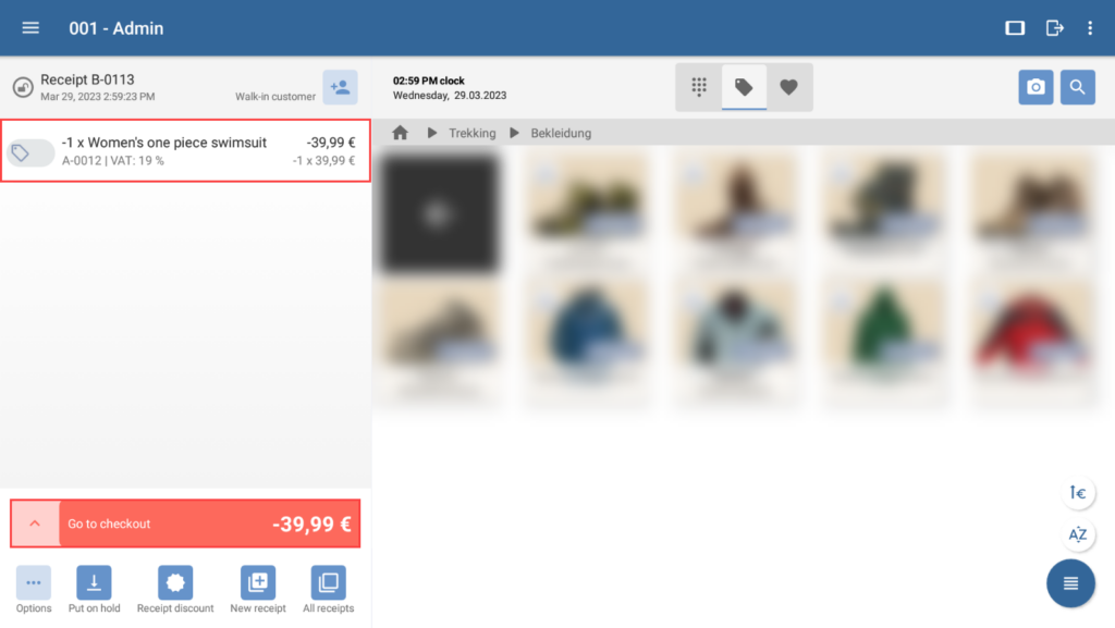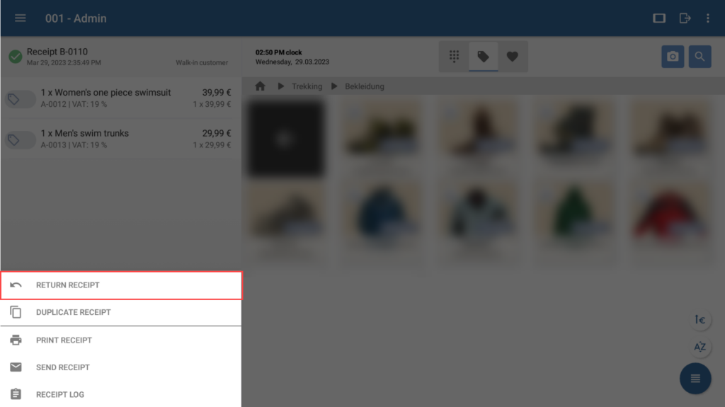 - Select the receipt in the list for which you want to carry out a return or exchange. You can now view the receipt in the receipt view.