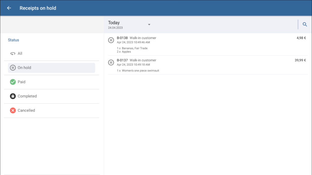 - Click on the On hold status. Here, you will see all receipts on hold.