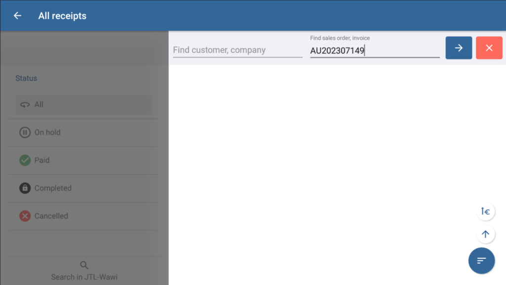 - In the search fields, enter either the name of the customer or their company or, alternatively, the sales order number or the invoice ID and confirm by tapping on the arrow button. You will see all orders that match your search query.