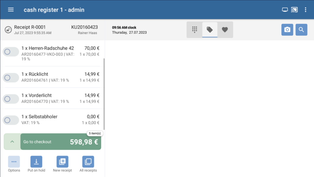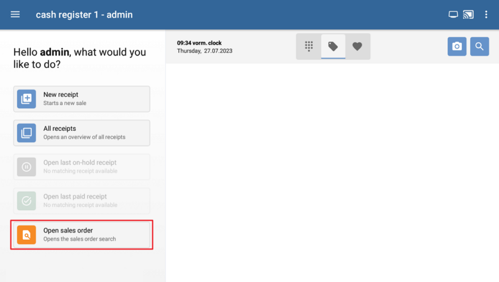 - Confirm with Yes. The sales order will be loaded in the cashier view as a new receipt.