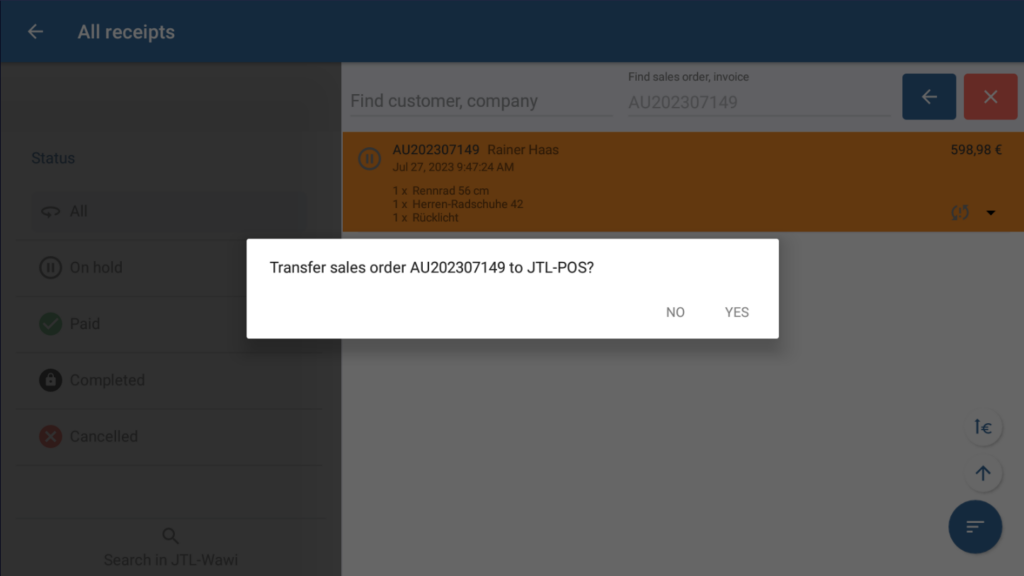 - Tap on the sales order that your customer would like to pay. A confirmation request will open, asking if you would like to transfer the sales order to JTL-POS.