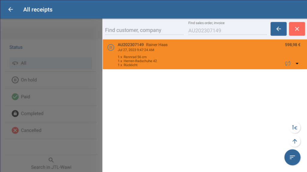 - Open JTL-POS and tap on the Open sales order. The search options will open.