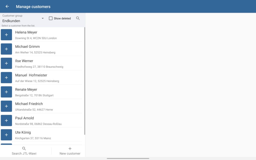 - If the customer has so far only existed in JTL-Wawi, they are not displayed in the customer database of JTL-POS on the left side of the window. Tap the Search JTL-Wawi button. The search view opens.