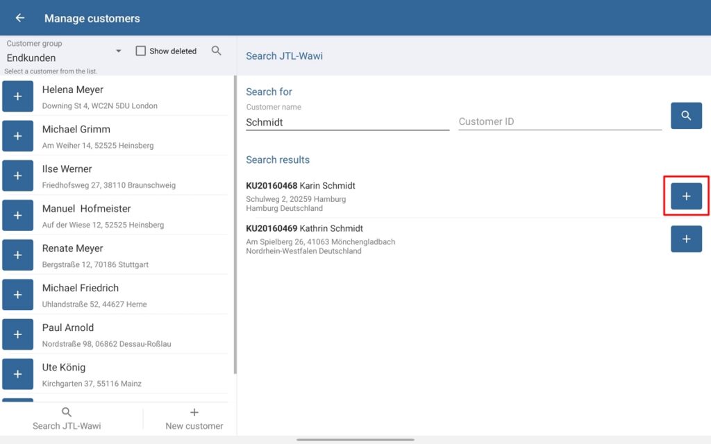 - When you have found the right customer in the search results, tap the plus icon next to their name. The customer is assigned to the receipt and simultaneously stored in the customer database of JTL-POS.