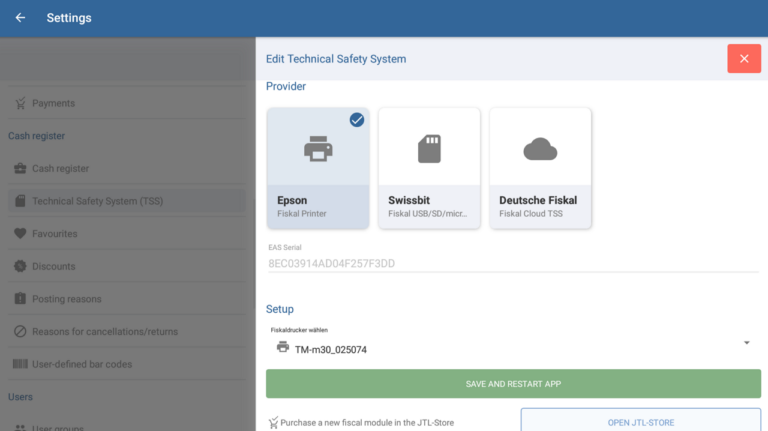 You can use a variety of hardware with JTL-POS. If you connect a printer, you can print receipts. With a separate display, you can show purchase information to the customer. By using TSS components, you make your cash register legally secure.