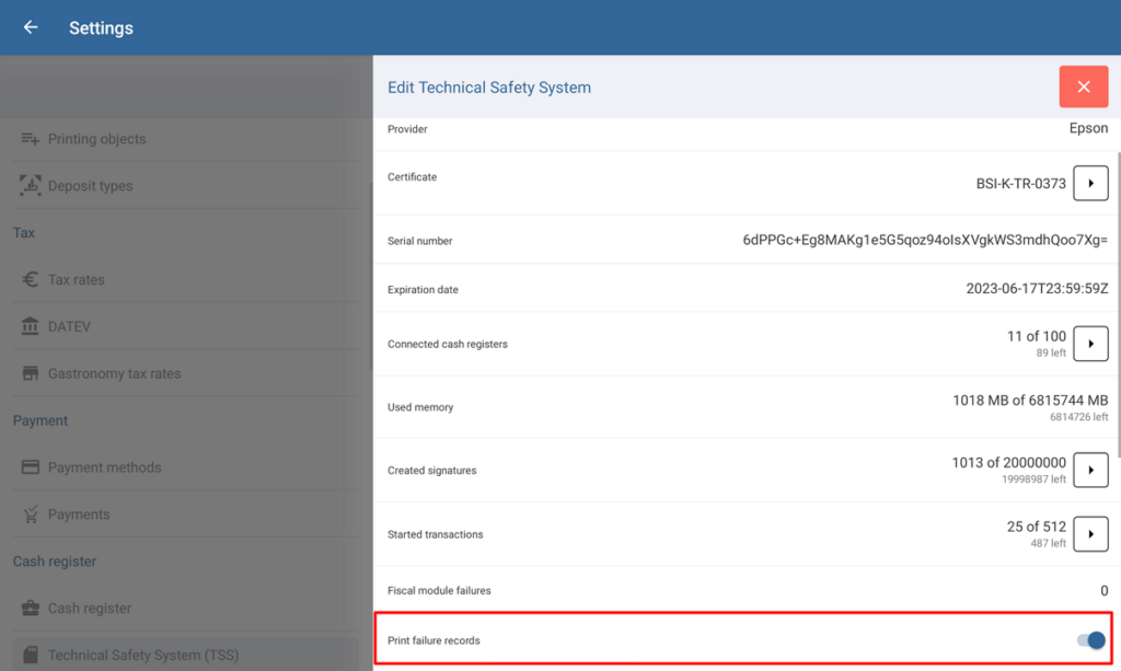 Failure number Receipt: The number of receipts affected by this failure. The number is automatically incremented, is linked to the serial number of the technical safety system and cannot be reset.