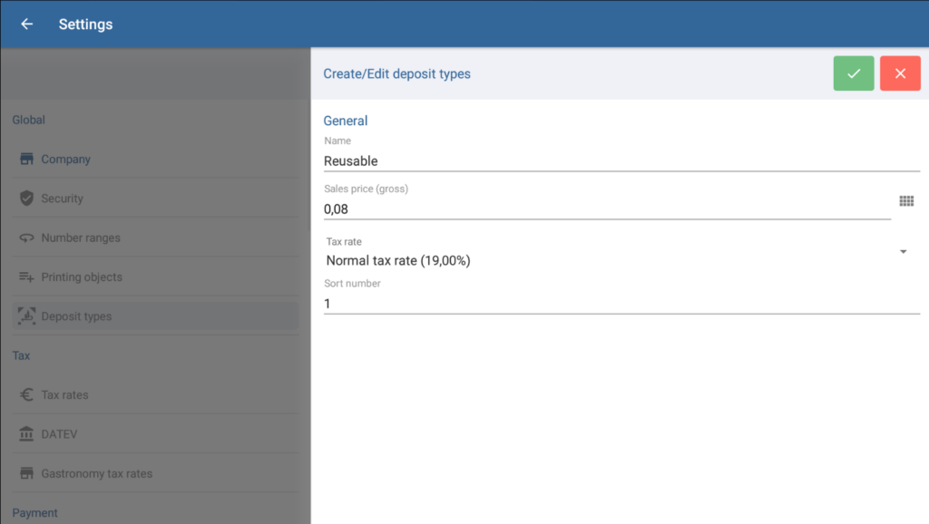 - Optionally, enter a sort number to tell JTL-POS where to display this deposit type in lists.