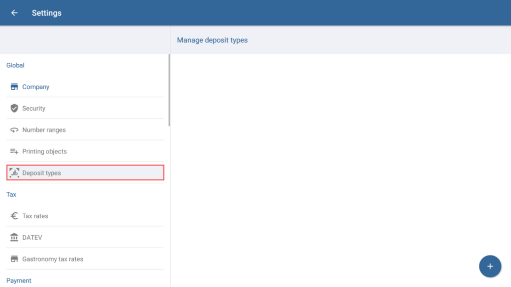 - In JTL-POS, open the menu and go to Settings. Then select the menu item Deposit types. The Manage deposit types dialogue box will open. Go to the help pages of the “Manage deposit types” dialogue box.