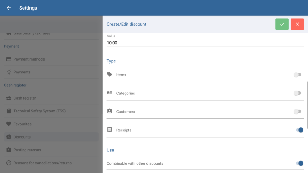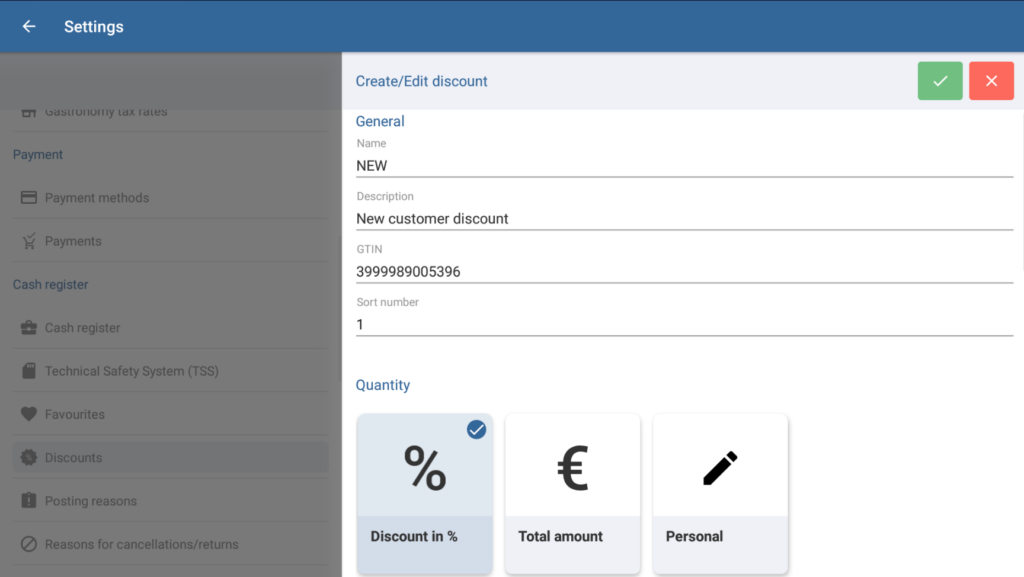 - Tap the ✓ icon to save the discount. You can now apply the discount to the selection you made under Type.