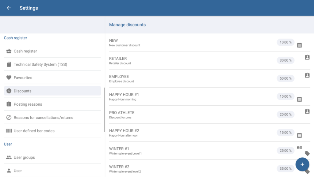 - Tap the plus icon to create a new discount. The Create/Edit discount dialogue box will open.