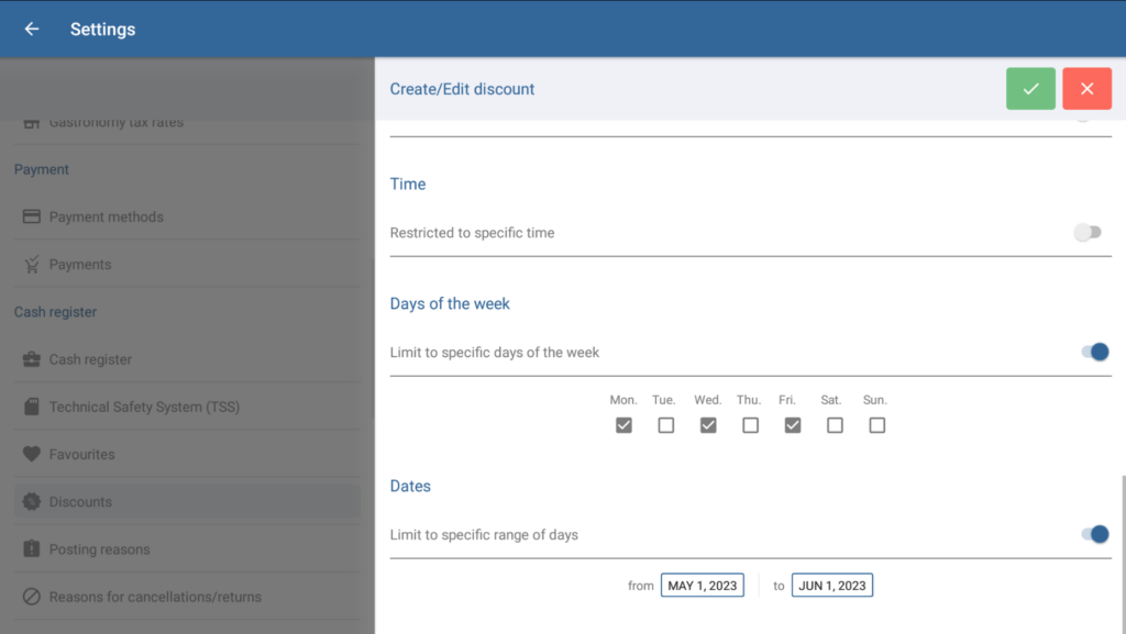 - Under Time, Days of the week, and Dates, specify the specific times at which the discount should apply. Outside this period, it will not be applied or taken into account. Enable the individual switches to configure the various options.