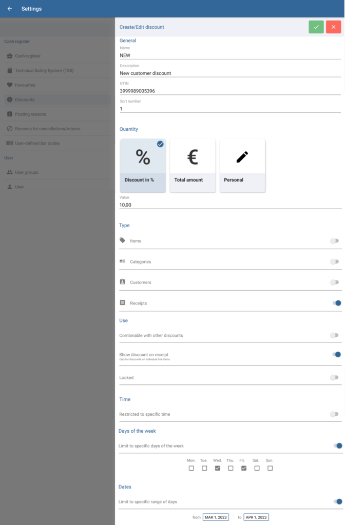 Personal: The value of a personal discount is determined at checkout. Here, only set the maximum amount of an individual discount on an item or a receipt.
