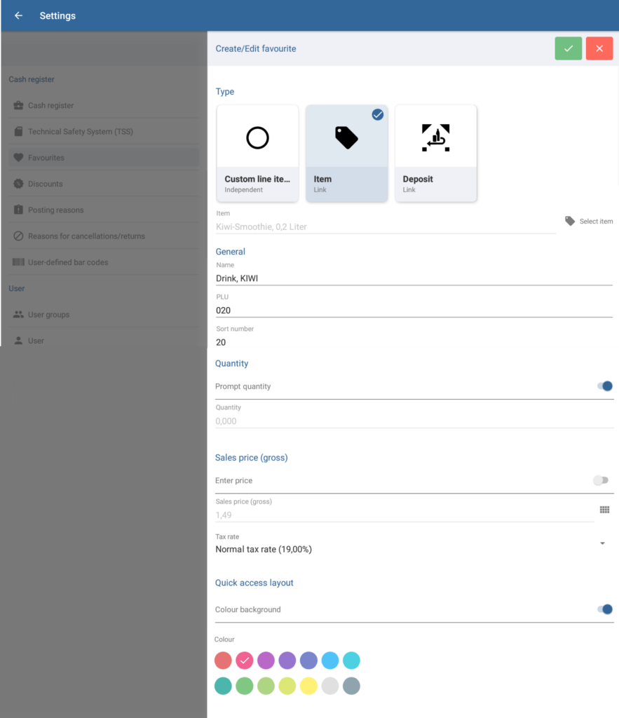 Deposit (Link): You can also link the favourite to a deposit type. To do this, tap on the deposit tile and under Deposit type, select one of the deposit types you have created in JTL-POS. Further reading: Setting up favourites for deposit refunds.