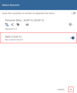 1. Enable any discounts you want to assign to the line item and confirm with OK. The display will switch back to the receipt view. The selected discount is displayed under the line item.