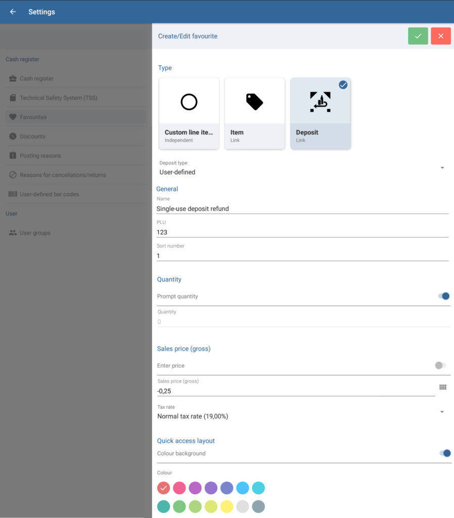2. Specify whether the quantity is to be prompted or whether the deposit should always be deducted only in a fixed quantity. In the second case, you must set the quantity to at least 1 so that you can save the favourite.