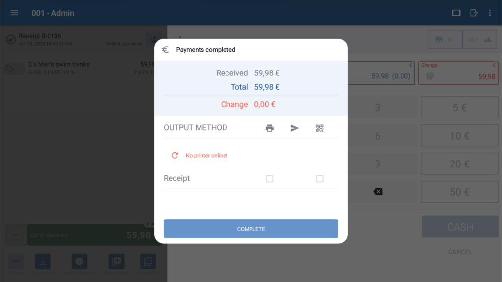 - Tap on Complete. The receipts will be issued and the cashier view will close.