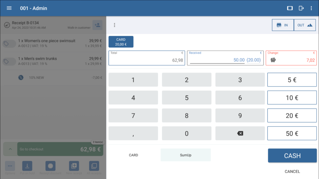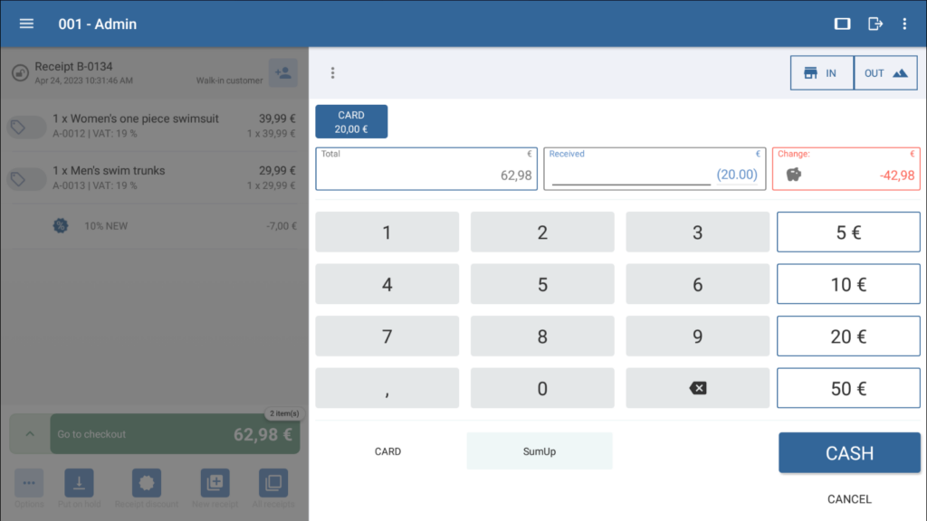 You have added all items that a customer would like to purchase to the receipt. The customer now wants to pay part of the purchase in cash and part of it with card.
