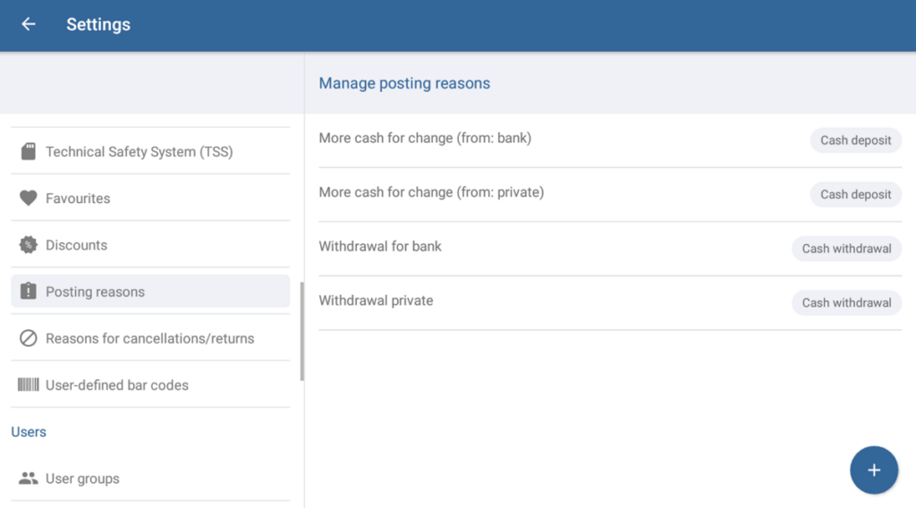 When you withdraw cash from the cash register or deposit cash, you must select a posting reason. The existing posting reasons are not sufficient, which is why you would like to create additional ones.