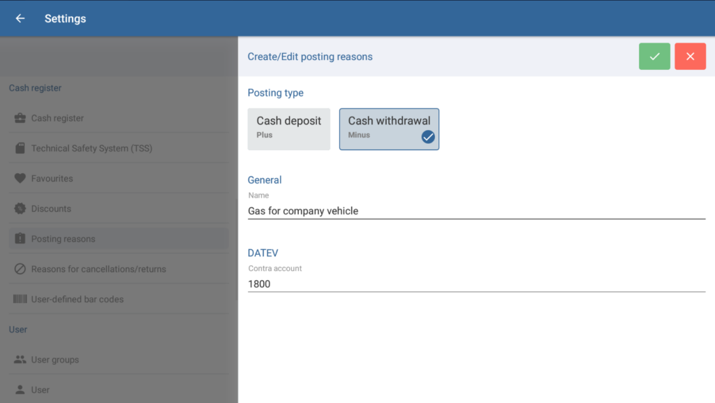 In the Create/Edit posting reasons dialogue box, you can define reasons for cash deposits and cash withdrawals for reporting purposes. When a user makes a deposit or withdrawal at the cash register, the user then selects the posting reason from a list. The posting reason is then issued on the posting record.