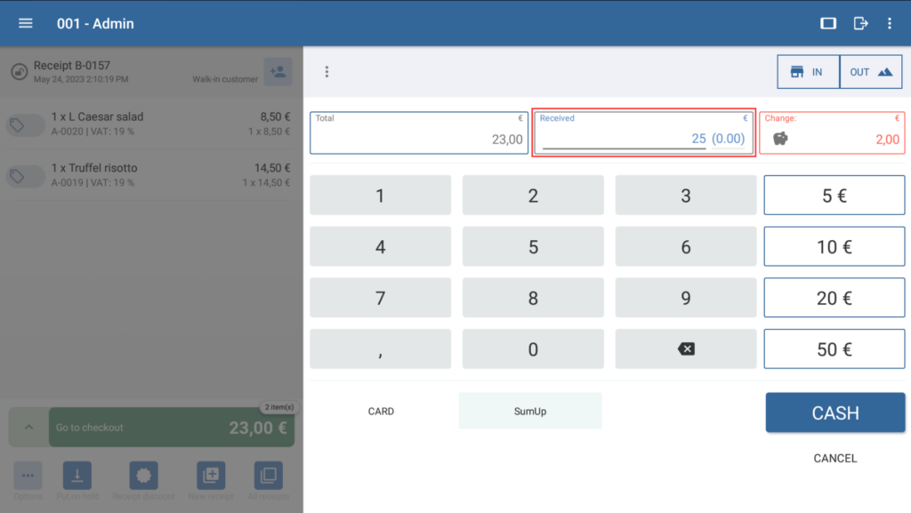 Example: Your customer would like to round up an amount from 24.45 to 30, i.e. tip you 5.55. Should your customer choose to pay by card, simply enter 30.00. If they would like to pay in cash, enter the actual amount your customer gave you.