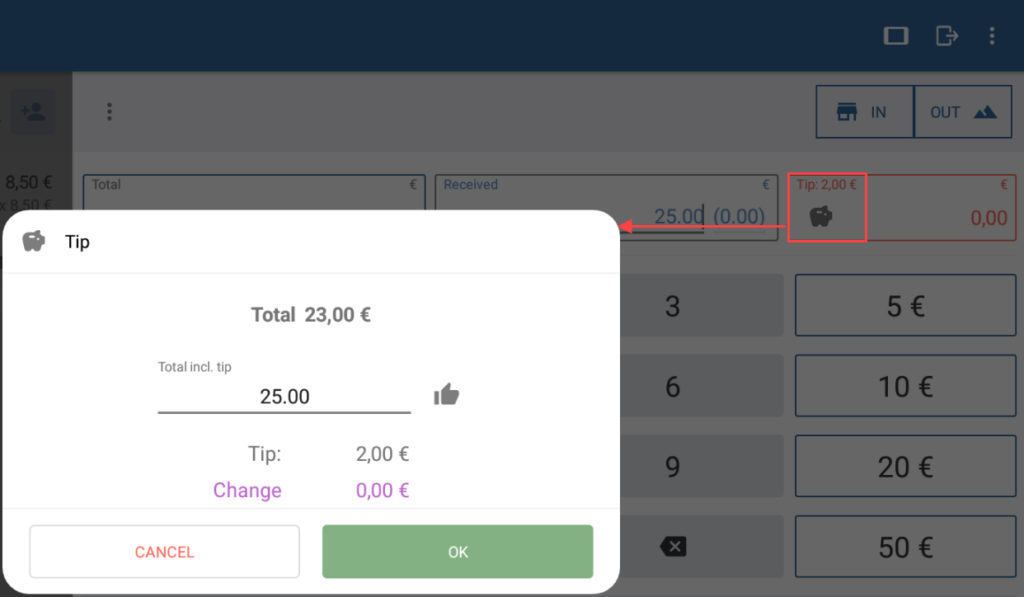 - Enter the total amount that your customer would like to pay, including tip. Under Tip, you can see the proportion of the amount that makes up the tip. Under Change, you can see how much money you need to return to the customer. With card payments, no change should be displayed.