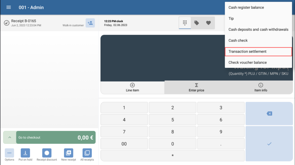 - In the upper right-hand corner of JTL-POS, tap on the three-dot menu and select Transaction settlement. The Transaction settlement dialogue box will open.