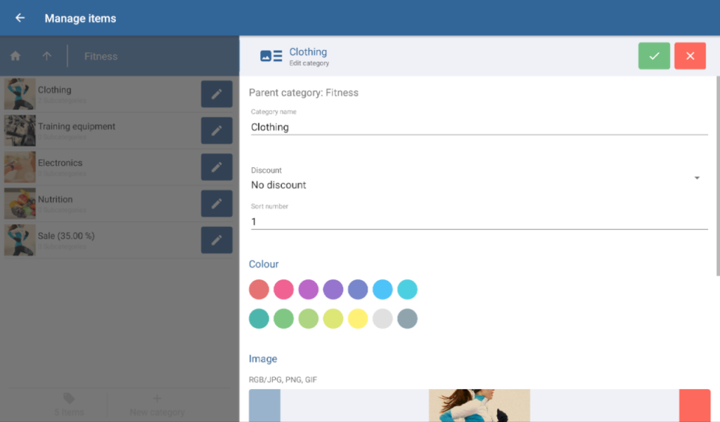 - To make it easier for the cashier to identify categories and to mark related categories, pick an image from the gallery and assign the category a colour.