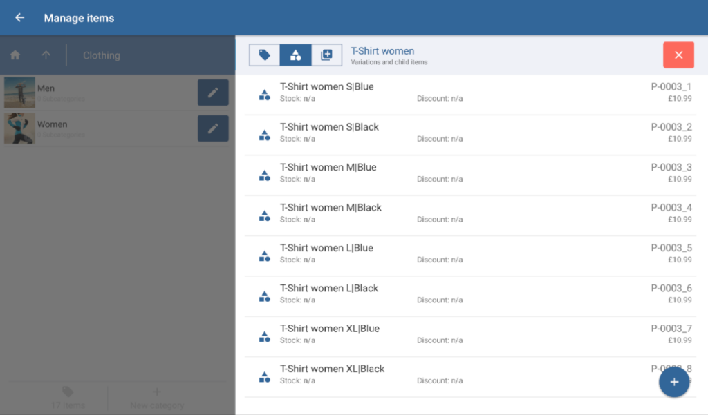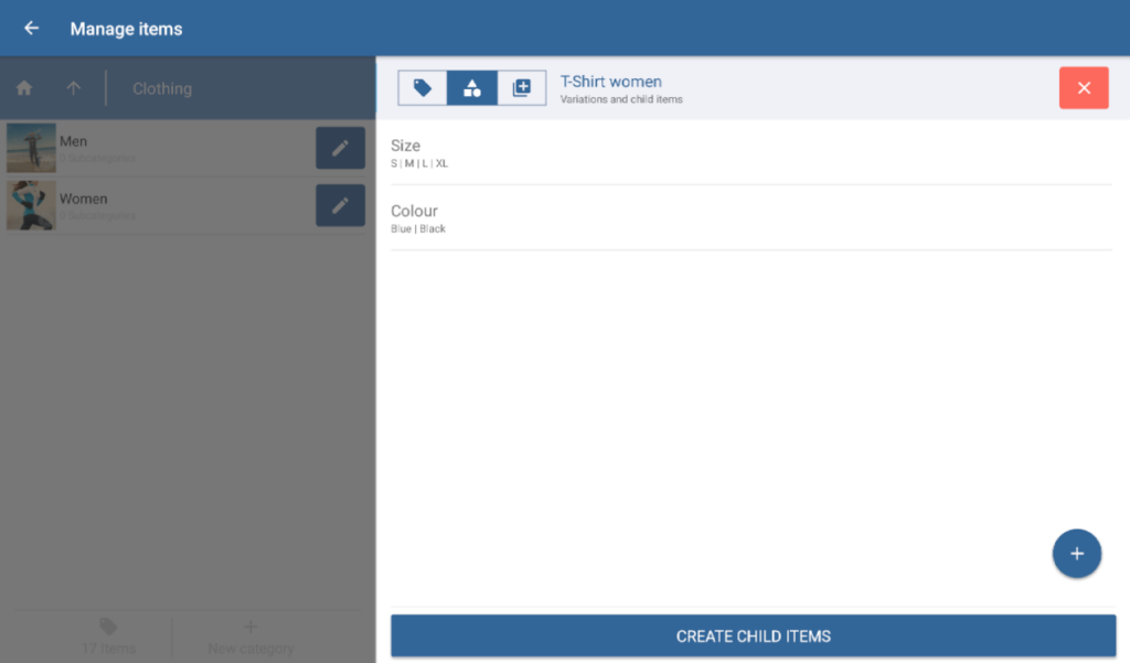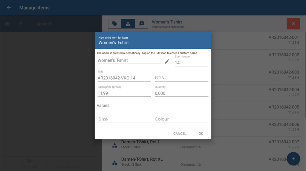 On this page you will learn how to manually create parent-child relationships and child items in JTL-POS. You can also import parent-child relationshipscand their data using the CSV import function of JTL-POS. Users of JTL-POS ERPConnected transfer parent-child relationships directly from JTL-Wawi to JTL-POS. Read our help pages on Creating child items to learn how to create child items and parent-child relationships in JTL-Wawi.