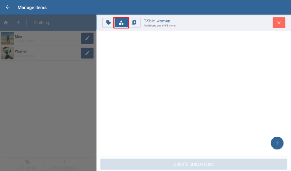 - Tap on the button Create variation (plus icon). The dialogue box Variation of item opens.