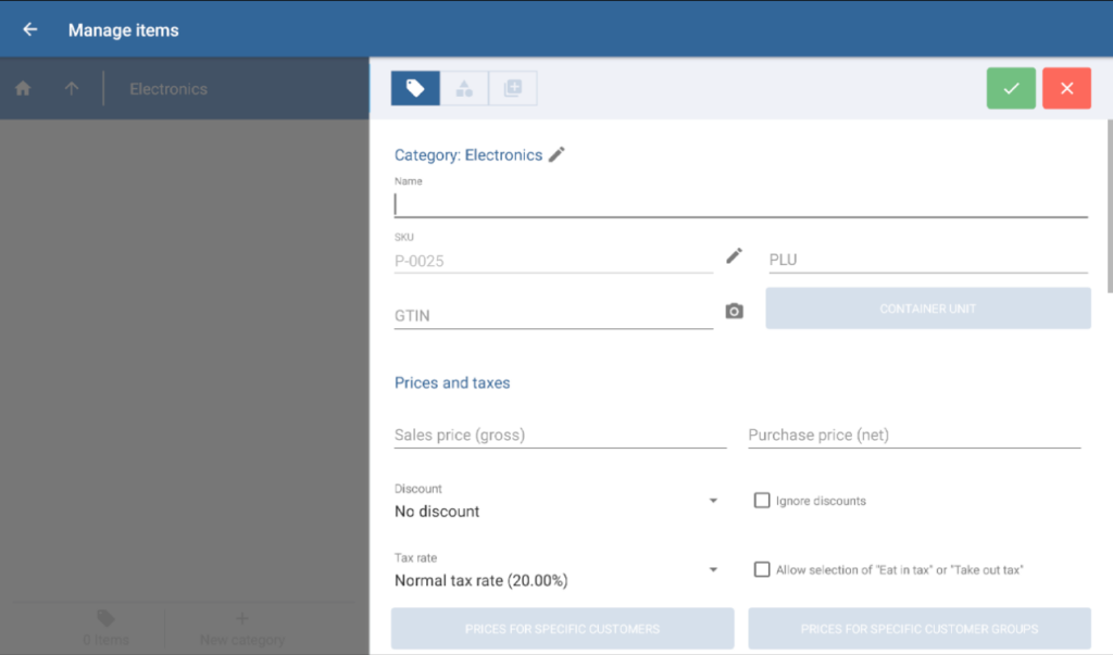 You have already created a category structure (see Creating categories) and would now like to create your first item. You would like the cashier to be able to enter the item by its PLU (price lookup code). To make it easier to identify the item, add an item image.