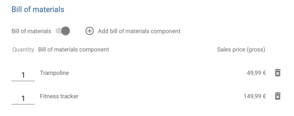 Bill of materials: Enable this option if your item is a bill of materials. Bills of materials (BOMs) are items comprised of several items. In case of a bill of materials, these are called components. With this option enabled, further settings become visible.