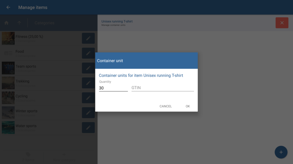 Manage container units: Opens the Manage container units dialogue box. Here you can specify whether the item is also sold in a container unit (e.g. 6-pack). Tap on the Plus icon to create a container unit. The Container unit dialogue opens. Enter the amount of the item in the container unit and the GTIN under which the container unit can be found. When you scan the GTIN of the container unit at the checkout, the quantity of the item in the container unit is automatically added to the receipt. The Container unit option is only available after the item has been saved at least once.