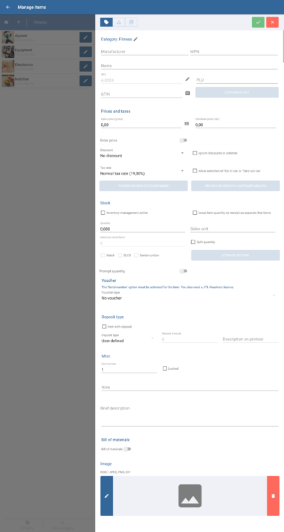 The dialogue box Item master data can be reached via the menu Items. Then tap on the button Create (plus icon) or Edit (pen icon).