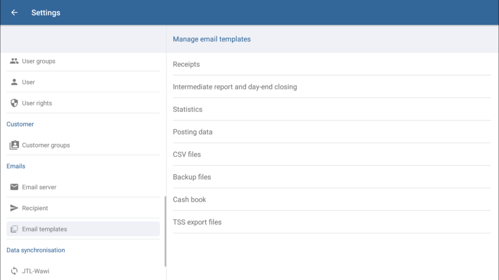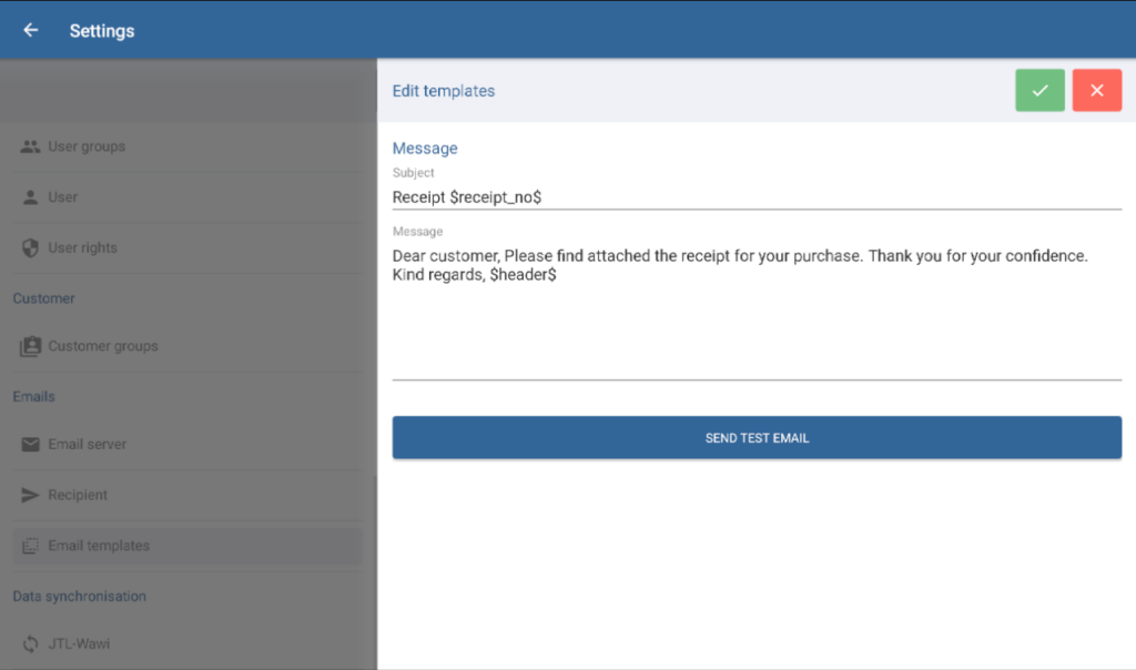Here, you can set up text templates for outgoing emails that are used to send attachments from JTL-POS. JTL-POS comes with text suggestions that you can adjust according to your individual needs and to which you can add more variables, if necessary. You can define a text for the subject and the body of the email. The emails with file attachments are sent to the email addresses saved under Settings > Recipient. Every time you select the option Send via email in any of the templates, an email with the respective attachment is sent automatically to the specified email address.