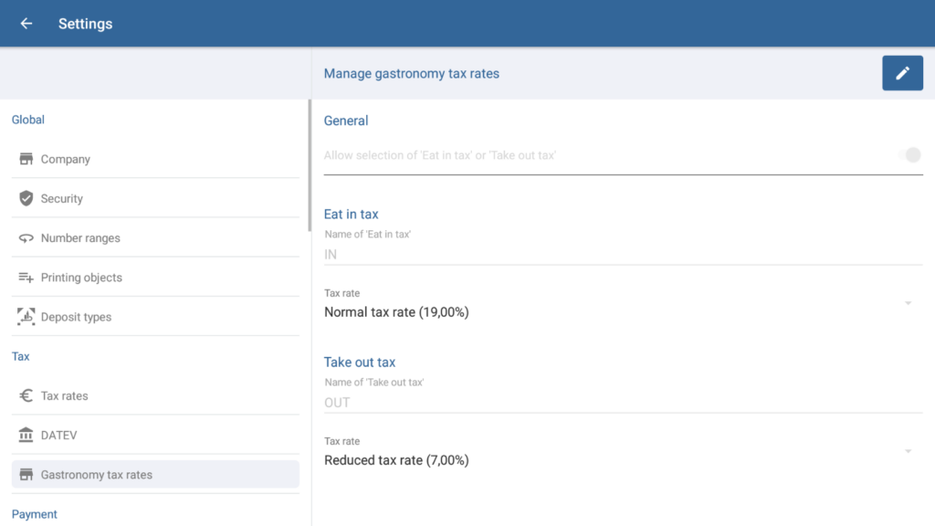Name of “Eat in tax”: Here, you can enter a name for the tax rate “Eat in”.