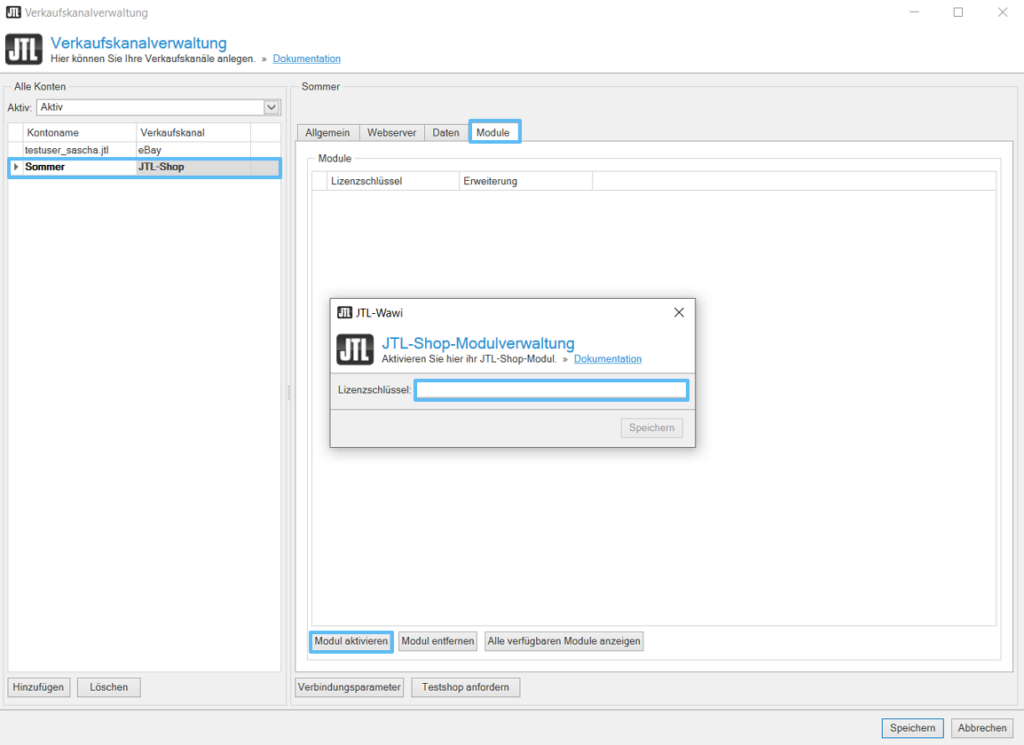 - Enter the licence key. Then click Save. The module will now be added to your JTL-Shop.