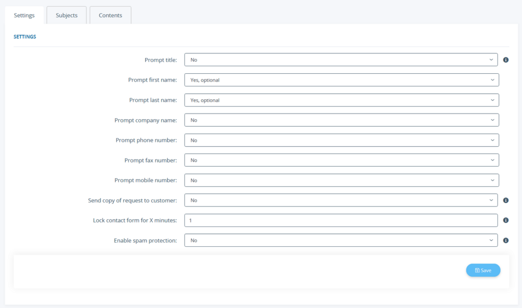 - Click New subject to create a subject. The Subject line of contact form page opens. Go to detailed description of all options.