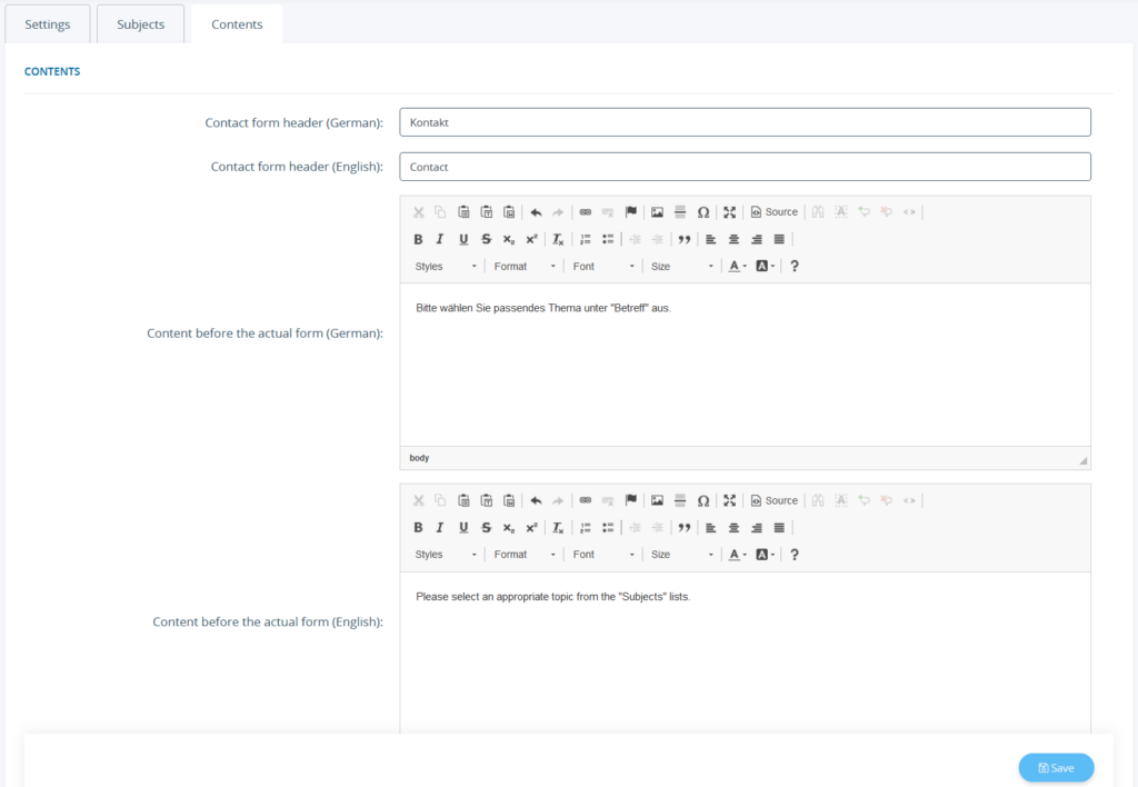 In addition to the form itself, you can also enter the texts that can be seen on the contact page. You can enter information for the texts before and after the form as well as the heading. You can enter all texts in all languages maintained in JTL-Shop.