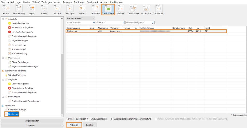 - In JTL-Wawi, open the Platforms area and scroll down to Online shop > New customers. The new customer overview opens.