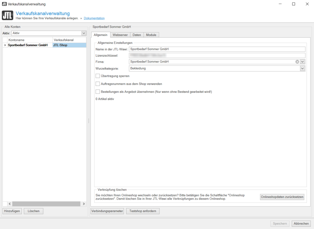 Delete: With this button you can delete a created account. Please note that all existing links to customer data and orders between JTL-Shop and JTL-Wawi are irrevocably lost!