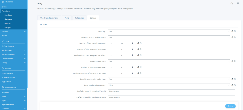 The settings Allow comments on blog posts and Activate comments are enabled by default for JTL-Shop. You can disable these settings under Marketing > Promotions > Blog posts > Settings.