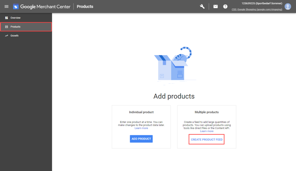 - In the Google Merchant Center, switch to the Products category and create a new data feed by clicking on Create Product Feed.