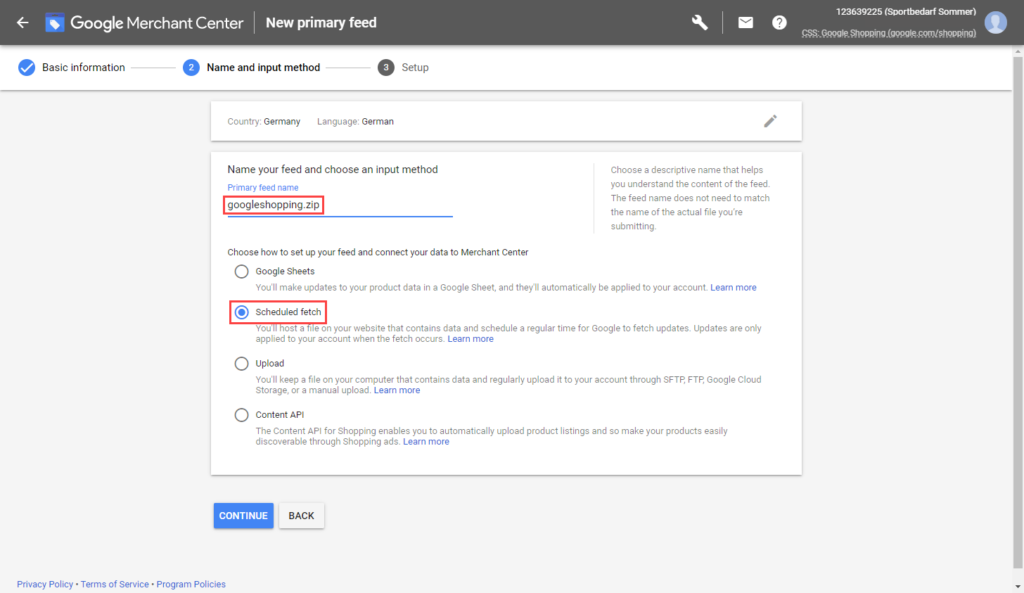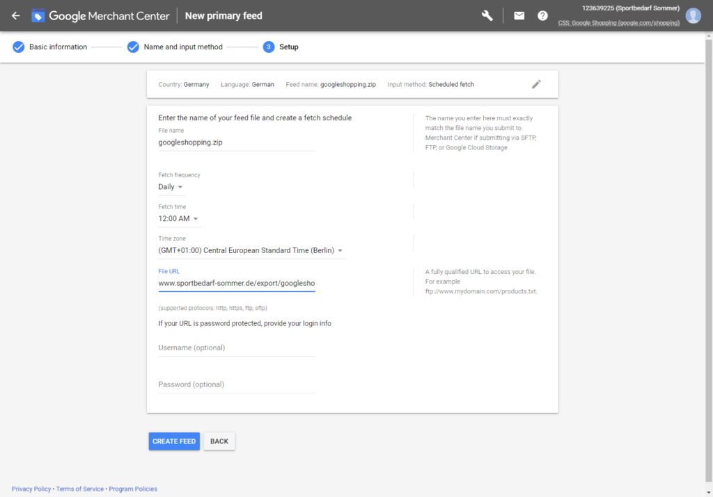 - Now create a schedule. Select Daily. Change the time to the time immediately after the automatic creation of your export file using the task scheduler in JTL-Shop. Select the correct time zone (e.g. GMT +1 Berlin for Germany) and indicate where the export file can be downloaded(http://www.YourDomain.de/export/googleshopping.zip). Click on Create Feed. Your feed will now be retrieved.