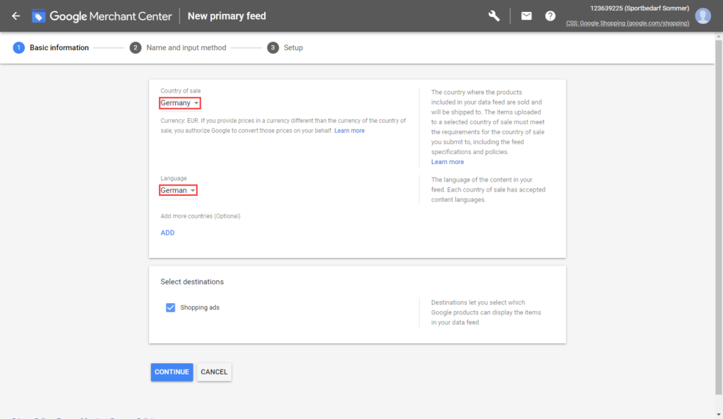 - Specify a destination country and language for the feed and click Continue.